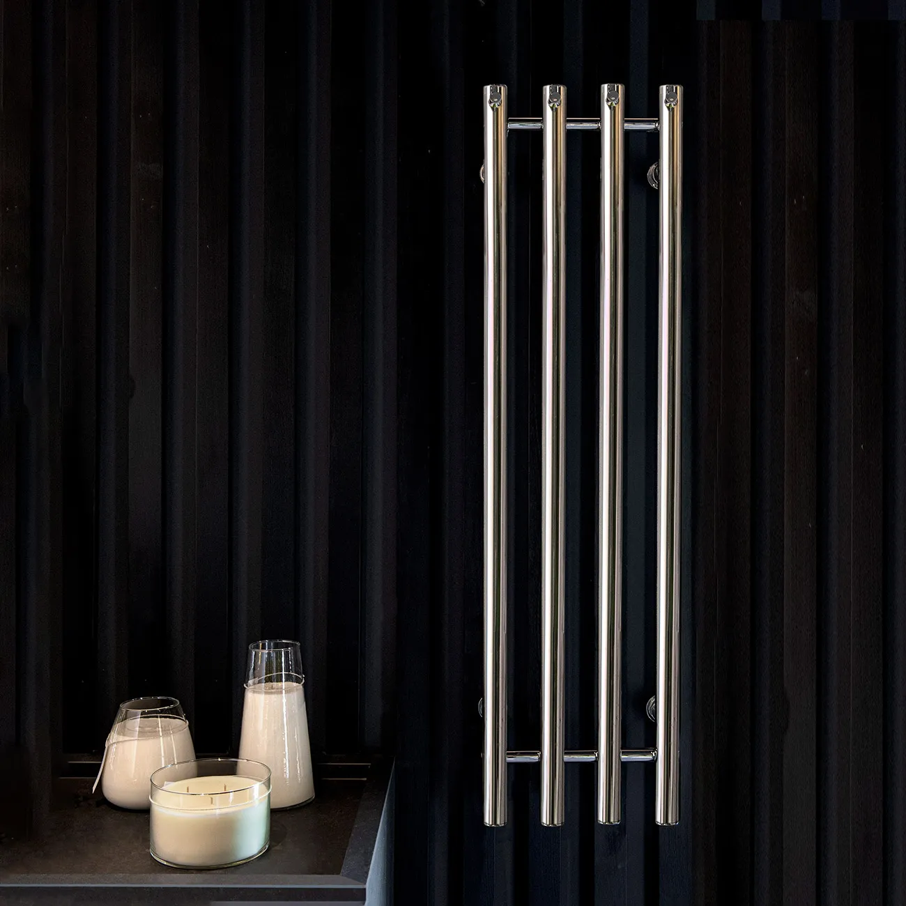 Toallero eléctrico premium de acero inoxidable de 26 x 95 x 11 cm – 86 watts de diseño vertical y angosto, es ideal para economizar espacio.