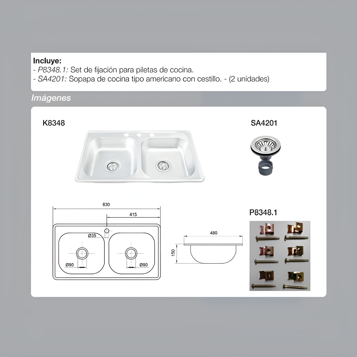 Bacha De Cocina Doble Acero Piazza K8348 83x48x15cm