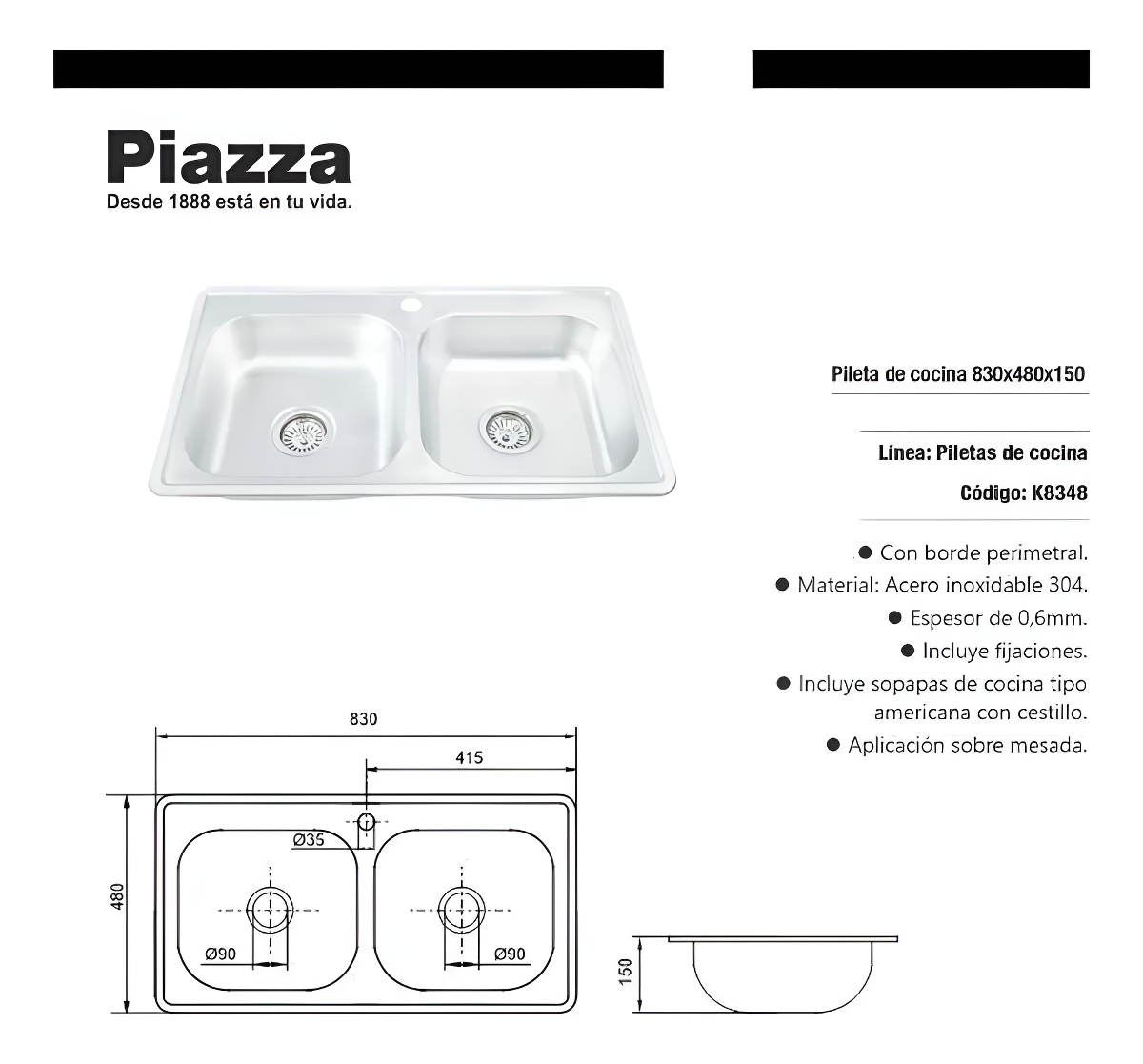 Bacha de cocina doble Piazza K8348 acero inoxidable