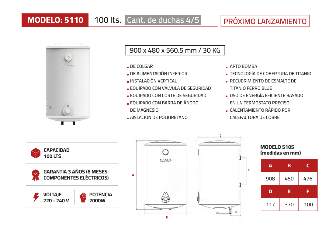 Termotanque Eléctrico Clever 100 Lts – Modelo 5110 | Alta eficiencia y seguridad
